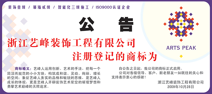 浙江艺峰装饰商标注册公告